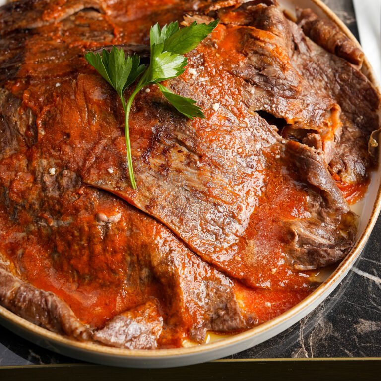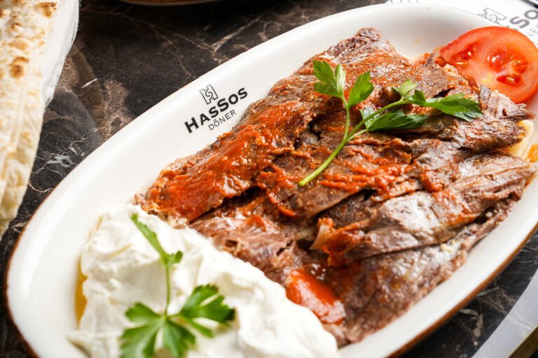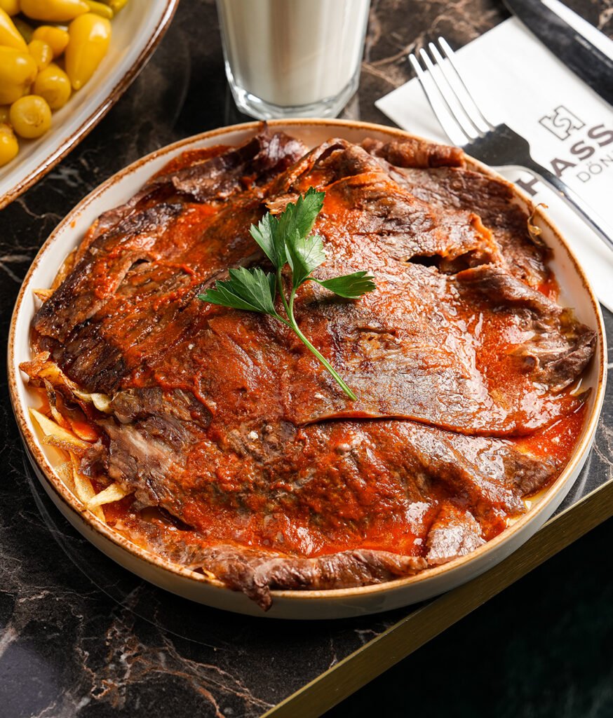 Tender Yaprak Döner layered with homemade tomato sauce, yoghurt, and a drizzle of melted butter.